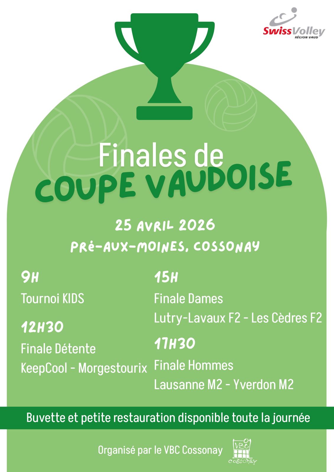 Toutes et tous à la salle du Pré-aux-Moines de Cossonay samedi 25 avril pour les finales de la Coupe vaudoise ! Venez nombreux et nombreuses encourager les équipes lors de cet événement !